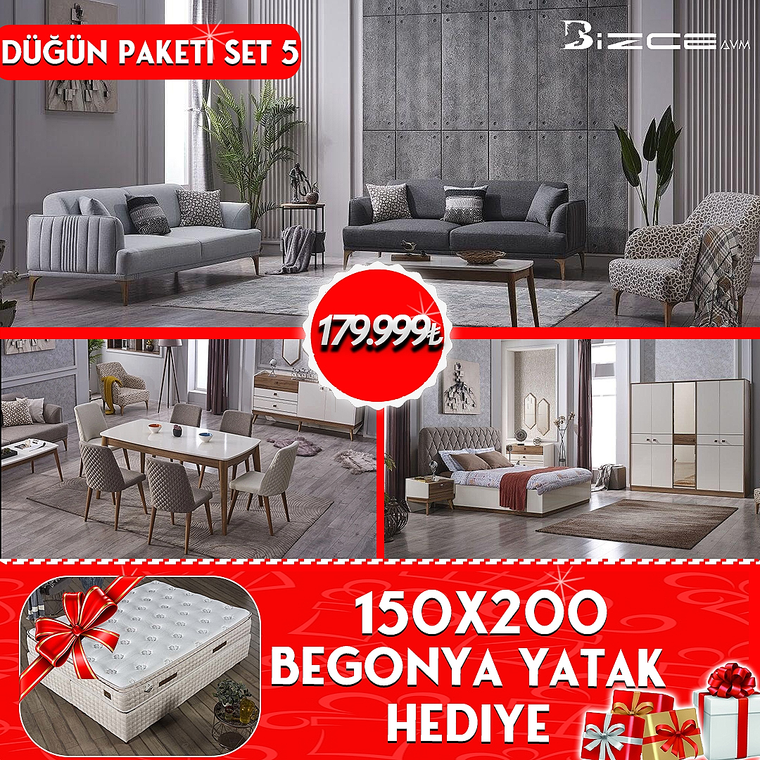 Evlenmek üzere olan çiftler ya da evinde köklü bir değişim yapmak isteyenler için özel olarak hazırlanan Mobilya Düğün Paketi #5, şıklığı, kaliteyi ve fonksiyonelliği bir arada sunuyor. Tamamı Ferrera serisine ait olan koltuk, yatak ve yemek odası takımları ile bütünsel bir dekorasyon deneyimi sunan bu paket, Çorlu düğün paketleri arasında ön plana çıkmaktadır. Üstelik, 150x200 ebatlarında konforlu Begonya yatak da bu pakete hediye olarak dahil!