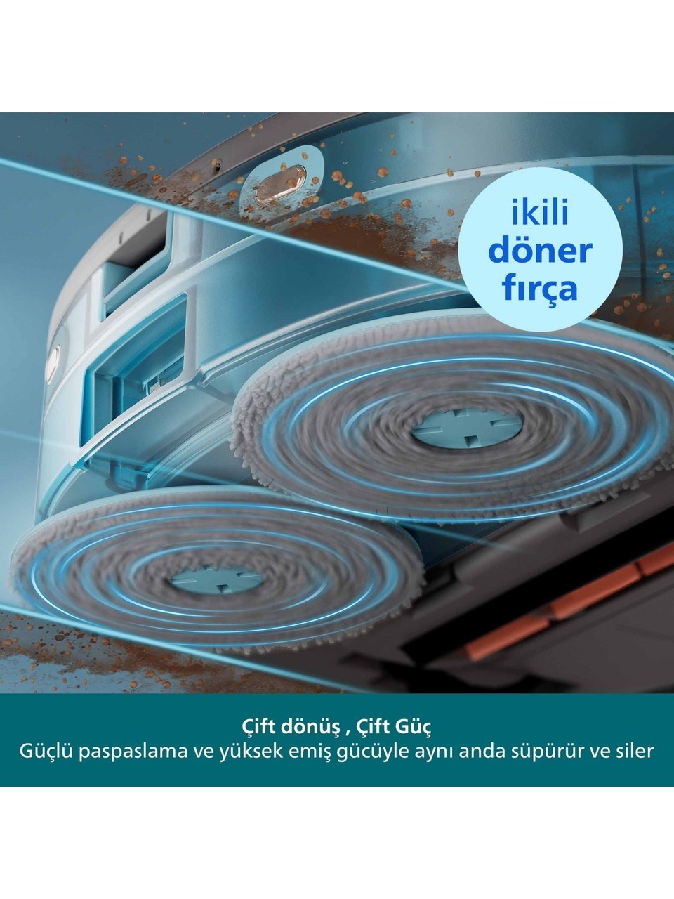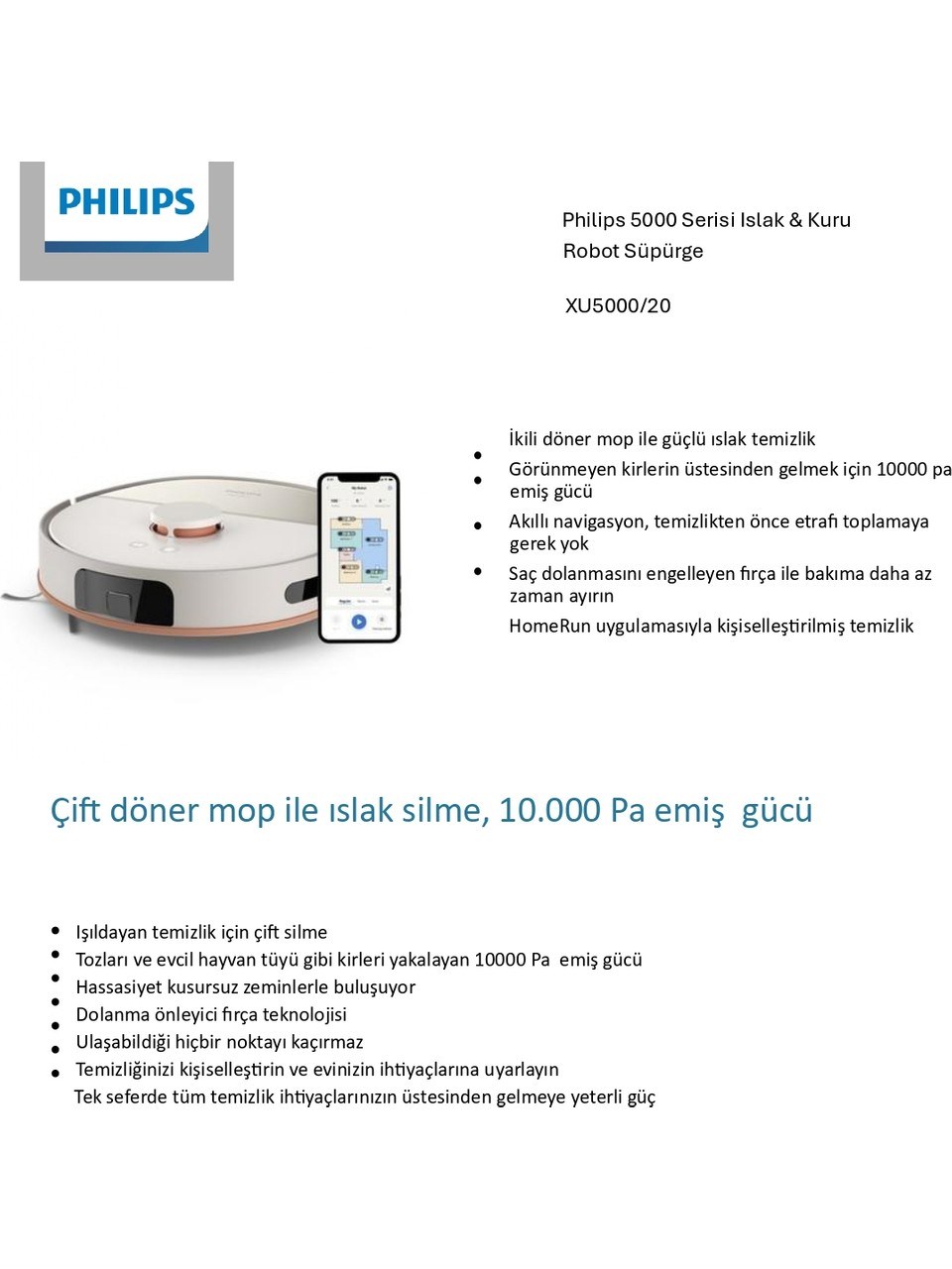 Philips HomeRun 5000 Islak ve Kuru Robot Süpürge, ev temizliğinde kusursuz sonuçlar isteyenler için tasarlanmıştır. Çift dönüş teknolojisi sayesinde aynı anda süpürme ve silme işlemini gerçekleştirerek derinlemesine temizlik sunar. Yüksek emiş gücü 10.000 Pa seviyesine kadar çıkarak evcil hayvan tüylerini, tozları ve gözle görülmeyen kirleri bile kolayca ortadan kaldırır. Robotun hassas sensörleri mobilyaların çevresinde, halıların üzerinde ve dar alanlarda ustaca hareket ederek hiçbir noktayı atlamadan kapsamlı temizlik sağlar. Akıllı lazer haritalama özelliği evinizi tanıyıp en verimli temizlik rotasını çıkarır ve tüm alanları titizlikle temizler. 4800 mAh güçlü lityum iyon pil, tek şarjla 200 dakikaya kadar kesintisiz çalışma imkânı sunarak büyük evlerde bile tek seferde temizlik yapabilmenizi sağlar. Saç dolanmasını önleyen özel fırça tasarımı, bakım ihtiyacını azaltır ve cihazın her zaman yüksek performans göstermesine yardımcı olur. Sessiz çalışma teknolojisi sayesinde günlük yaşamınızı rahatsız etmeden güçlü temizlik yapar. Philips HomeRun uygulaması sayesinde temizlik planlarını kişiselleştirebilir, farklı odalara özel zamanlama yapabilir ve cihazı dilediğiniz gibi kontrol edebilirsiniz. Akıllı kontrol sayesinde evinizin ihtiyaçlarına uygun temizlik deneyimi yaşarsınız. Hem sert zeminlerde hem de halılarda üstün performans gösteren Philips HomeRun 5000, ışıldayan temizlik için çift silme özelliği, derinlemesine hijyen sağlayan güçlü emişi ve pratik kullanım avantajlarıyla öne çıkar. Evinizin her köşesini kusursuzca temizleyen bu robot süpürge, sadece temizlik değil aynı zamanda size konfor, zaman tasarrufu ve huzurlu bir yaşam alanı sunar.